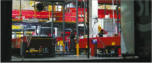 凌晨2点的顺丰快递中转站外,温度只有12摄氏度,主管史成功指挥着几辆大快递车驶入了顺丰快递的大门,停在仓库的卸车口。货车里的货物不断被转移到传送带上,五六条传送带同时启动,向架在空中的矩阵机驶去,矩阵机为快递提供了一次“空中旅行”的机会,为保护货物,从矩阵向下输送时设置的双层减速带被不断接踵而至的货物撞击,不到一秒钟就要响一次。撞击声冲击着耳膜,像是来自机器的一声声催促。