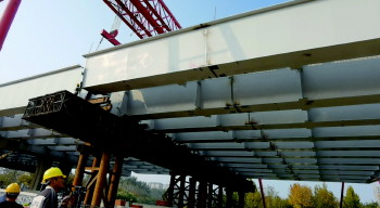 下午2点40左右,宝通街快速路改造高架桥虞河段最后一片箱梁开始吊装,随着指挥者一声令下,两台吊车同时启动,被固定好的钢箱梁缓缓离开地面,一点点抬高,然后朝盖梁落了下去。大概半小时左右,最后一片箱梁顺利落到盖梁上,与前后两片箱梁严丝合缝地拼接在一起。