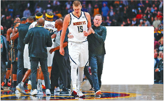 对犯规动作不满,约基奇撞翻大莫里斯双双被驱逐。 IC photo