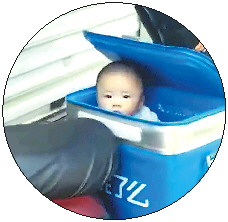 ◤当年仅6个月大的霏儿在爸爸的外卖箱里。