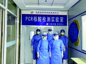 核酸检测队员邓硕(前排左)、王燕(前排右)、綦学玲(后排左)、张治旺(后排中)、张蕾(后排右)