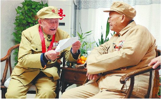 图为:70年后再相聚,何伯超拿出自己写的一首诗读给高万功听,两位老人忆往昔话今朝。 齐鲁晚报·齐鲁壹点记者 李楠楠 通讯员 张建鲁 摄影报道