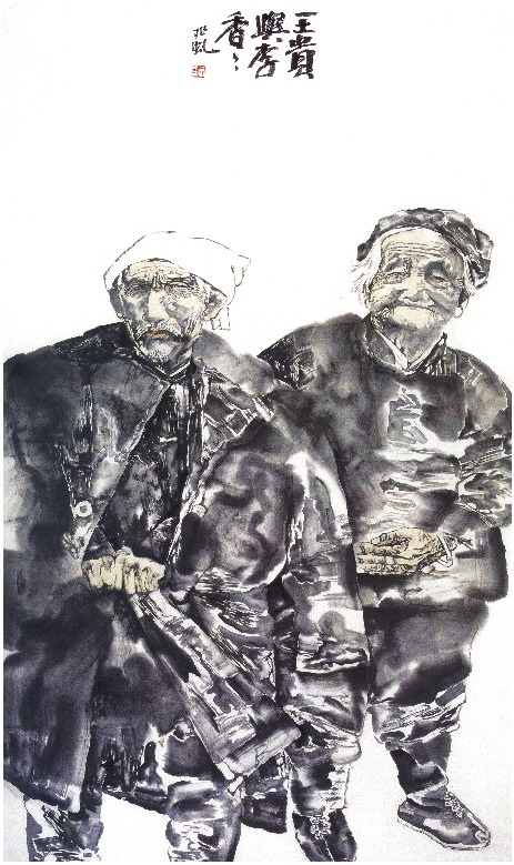 那是在2004年,李兆虬在中央美院进修归来,状态极好,看到什么都想画一画。一天,他偶尔得到一张农村老太太的肖像照,朴实、亲切的如自己的姥姥,所以,他顺手就在纸上画了出来。为了进一步完善创作,他还结合自己在中央美院进修时学习的形式构成的知识,画了一个老太太和一个老汉儿。老汉儿的形象顶天立地,“出血”式的设计大胆地延伸出画面,极富视觉冲击力。相比之下,老太太的形象十分完整,她温和地微笑着,静静端坐在老头儿身后。如此,两位相濡以沫多年的年迈夫妻,经过人物形象的适当变形,以墨代色的施墨手法,实现了由传统中国画到当代水墨的转换。