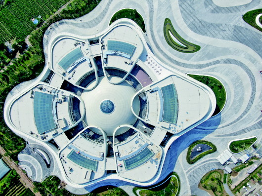 由中铁十四局集团设计、施工的金乡蒜都国际会展中心位于“大蒜之乡”山东省济宁市金乡县的现代农业园,建筑高22.9米,总面积约3万平方米,分地上3层,地下1层,为钢筋混凝土框架结构,一层获奖装饰面积约8900平方米。工程外形如六个“蒜瓣”,顶部造型为大蒜横切面,是以“大蒜文化”为主题,以“蒜姿曼舞”为设计理念,集科技研发、展示展览、检验检测、大数据、电子交易、农民培训等功能于一体,突出现代农业、科技农业的展馆。