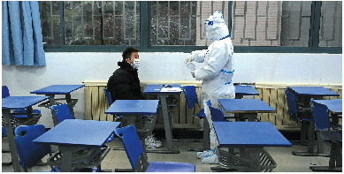 12月25日,在研究生招生考试西安外国语大学考点隔离考区,监考人员在单人隔离考场查看考生信息。 新华社发