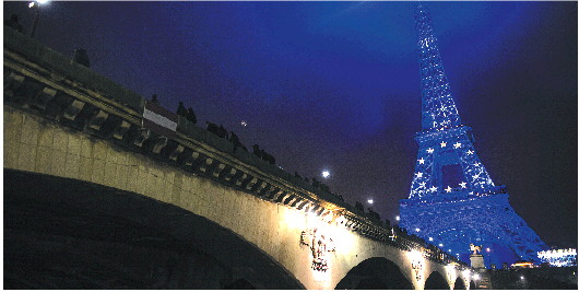 2021年12月31日,法国巴黎地标性建筑埃菲尔铁塔点亮欧盟旗帜图案的灯光。 新华社发