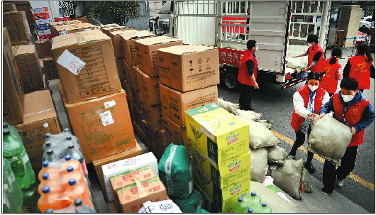 1月6日,西安市新城区青年志愿者在搬运各地捐献的抗疫物资。 新华社发