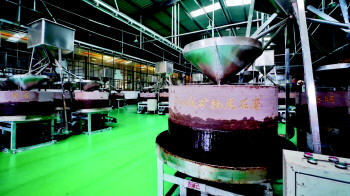 在研磨分油车间,记者看到,108盘刻有“水浒英雄名字”的石磨,轮流作业转动的景象颇为壮观。两三名技术工人将盛放芝麻的漏斗依次拖到磨盘上方,经过石磨转动和低温碾磨,芝麻变成油浆。