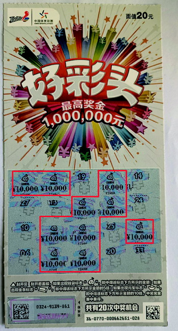 据了解,王先生特别喜爱顶呱刮即开票,这次来到店里,王先生先刮了几张2元的“太空寻宝”,刮完后看到柜台外边摆放着4张“好彩头”,觉得这个票寓意特别好,就把这4张票全买了,刮开最后一张的时候,彩票上出现了10个“钱袋”标志,当刮开“钱袋”下面的中奖金额时,每个“钱袋”下边都显示10000元,加起来共10万元。“中了!中了10万元!”王先生抑制不住内心的激动,惊呼道。在场的朋友们闻声都围了过来,现场沸腾起来,大家纷纷对王先生表示祝贺。