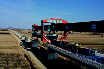 2月21日,数十名架梁人员不畏寒冷,正在对黄垒河特大桥进行箱梁架设施工,现场一派忙碌的景象。黄垒河特大桥全长8.1公里,是莱荣铁路三标段的重点控制性工程。为保证工期节点按时完成,打通铺轨通道,现已跨过该桥唯一连续梁,架梁队以每天2-3榀箱梁的架设速度推进黄垒河特大桥的架梁施工。