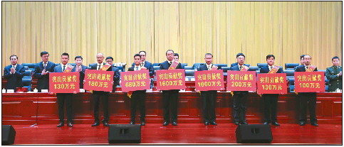 与会领导为荣获经济建设突出贡献奖的企业颁发奖金。