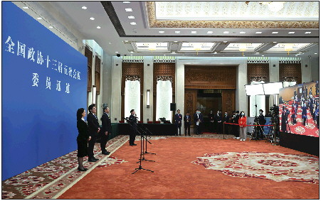 ◥全国政协十三届五次会议第二场“委员通道”采访活动在人民大会堂新闻发布厅举行。 新华社发