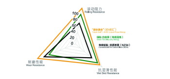 国家橡胶与轮胎工程技术研究中心首席顾问、怡维怡橡胶研究院常务副院长许叔亮在接受媒体采访时,这样举例:假如炭黑轮胎在节油、耐磨、抗湿滑这三方面的性能指数均为100,分值越高代表性能越优,那第三代绿色轮胎将滚动阻力、湿地抓地两方面的性能分别提高到了120、110左右,但相对的耐磨性降低到了80左右;而液体黄金轮胎将滚动阻力、耐磨性、湿地抓地性能分别提高到了140、150、115左右。也就是说,液体黄金轮胎的耐磨性能其实表现最为突出,一条液体黄金轿车胎使用寿命可延长1/2甚至一倍以上,两条至少可以顶原先的三条用。