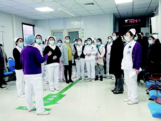 十分钟后,后备人员陆续到位。张梅按照各区域需求,对到位人员进行分组(发热门诊、隔离病房组、发热儿童输液组、门急诊预检分诊组、重症救护队组)。各组后备人员在各区域护士长带领下进入工作区,并现场熟悉区域的环境及布局流程,了解工作职责及防护注意事项。