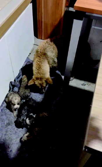 刘先生告诉记者,3月25日下午,天上下起了不小的雨,他与妻子在店内角落处发现了一只大黄狗叼过来的几只小狗。大黄狗原为刘先生房东家所养,因房东常年不在家,大黄便在外流浪,刘先生也常常投喂大黄。