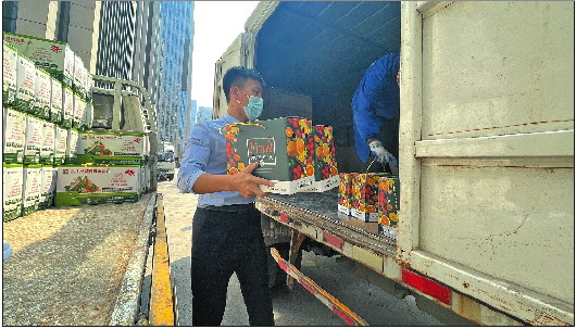 上午10:44,第一份礼盒送到了万科城顾客的手中。送达后,送货车又匆匆向下一个目的地驶去。