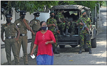 4月2日,一名女子从斯里兰卡科伦坡街头警戒的特别任务部队成员前走过。新华/法新