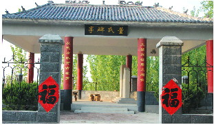 前面立有两座高1.8米、宽60厘米、厚20厘米的石碑,北面这座石碑建于民国四年(1915年),上面的字迹也很模糊,内容同样是记载先人及建庙修庙的前后经过。南边这座石碑,是碑亭中最珍贵的,仔细观看上面的碑文我们得知,董家祠堂最早建于1636年,因黄河水泛滥泡坏倾废。董家人在民国四年重修并制作亭内北面的石碑一方,而且建造得非常庄重严整。只是由于黄河滩地松软的缘故,祠堂的墙基不稳,屋顶也时常漏雨。民国十年(1921年)夏,大雨下了一个多月,此时河水暴涨,董庄村周围一片汪洋,董家祠堂被毁,董家人费尽周折,再次将祠堂修好,之后又在附近建起村学一座。