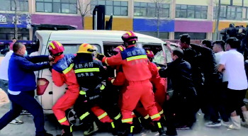 随后,救援人员迅速对面包车驾驶员展开救援,第一步使用扩张器将变形的驾驶室车门打开,第二步利用剪切钳对前挡风玻璃进行破拆。由于驾驶员被变形驾驶室死死挤住,腿部无法动弹,救援人员又用电动液压顶杆进行扩张。经过半个小时的紧张救援,终于扩张出一定的空间,驾驶员被救出,抬上120急救车送往医院。