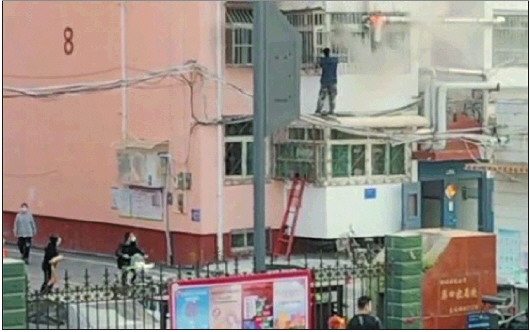 为了避免火势继续蔓延,王付兴便在着火的单元楼下寻找消防栓,但是消防栓距离都比较远,他就去小区门卫室里找到两个干粉灭火器,拿着干粉灭火器紧急赶到了着火的住户楼下。由于着火的住户是二楼,他又跑回门卫室旁边,拿了一个梯子,再次紧急返回。王付兴爬到梯子上,现场的社区网格员在楼下给他递干粉灭火器,他拿着干粉灭火器控制住火势后,住户也从外边赶了回来,住户打开房门后,在屋里拿灭火器继续把火扑灭。