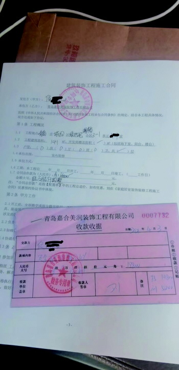 记者看到,侯先生提供的《建筑装饰工程施工合同》显示,承包方(乙方)是青岛嘉合美润装饰工程有限公司,合同约定总价款为人民币66000元,侯先生提供的收据显示:“定金20%+首期款10%,共计19800元。”“因为一直是跟上宸幸福家谈的,当时我看到这个嘉合美润时也觉得不对,就提出来为什么不是和上宸公司签合同,业务员就解释他们是上宸公司的下属公司,我也就没再怀疑。”侯先生说,最近他快交房了,准备联系装饰公司施工时,却发现业务员的电话已经打不通,原来在黑龙江中路上的“上宸大厦”也已经人去楼空。