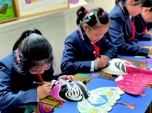 ◥立德学校的孩子们学习绘制京剧脸谱。