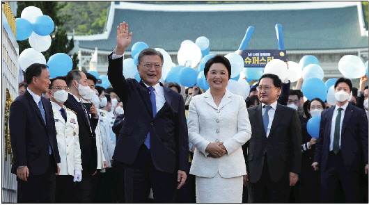 9日,韩国总统文在寅结束任期间最后一天工作后,与工作人员及支持者道别。 IC photo