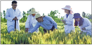 山农大孔令让团队成员在小麦实验田做研究。 受访者供图