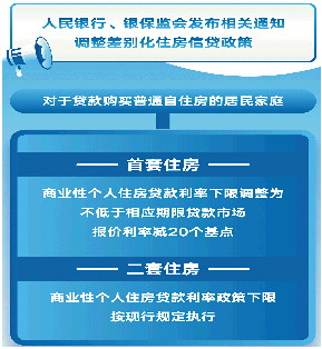 据新华社北京5月15日电 记者15日从中国人民银行获悉,人民银行、银保监会发布相关通知,调整差别化住房信贷政策。对于贷款购买普通自住房的居民家庭,首套住房商业性个人住房贷款利率下限调整为不低于相应期限贷款市场报价利率减20个基点,二套住房商业性个人住房贷款利率政策下限按现行规定执行。政策调整后,按照4月20日发布的5年期以上LPR测算,首套房贷利率不得低于4.4%。