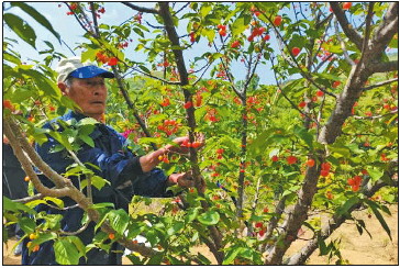 时下,正是西山村樱桃采摘季。走进一家樱桃园内,葱绿的叶片下,一颗颗圆滚滚的小樱桃色泽红润,令人垂涎;咬上一口,酸甜的滋味充满整个口腔回味无穷。
