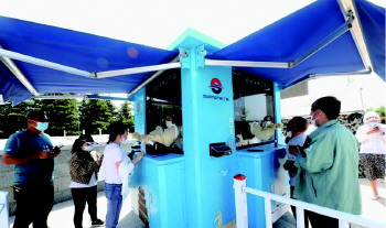 5月24日,在张村镇体育公园核酸采样点,环翠区首个移动式核酸采样工作站正式投入使用。5平米大的“蓝房子”里,空调、紫外线消毒灯、正压净化系统、话筒等设备一应俱全,外部设有垃圾区、样本区。