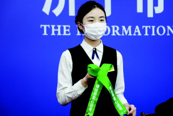 工作人员展示绿丝带。