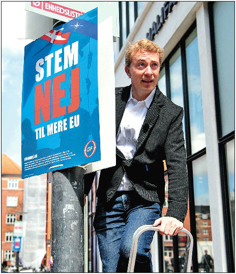 5月7日,政党代表在丹麦哥本哈根悬挂公民投票海报。 新华/美联