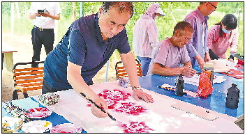 活动现场,书画爱好者们展纸挥毫,毛笔不停地在纸上来回飞舞,或行云流水,或刚毅遒劲,用笔墨丹青抒发对端午的热爱之情,同时表达了爱党、爱国、爱家乡的炽热情感。国色天香的牡丹、清新脱俗的荷花、苍劲有力的书法作品在书画爱好者的笔尖墨间出炉,呈现在大家眼前,让观者赏心悦目,赞叹不已。