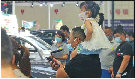 不少父母带孩子到齐鲁国际车展看车选车。 记者 张中 摄