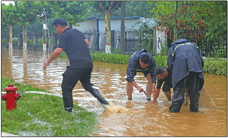 27日12时30分左右,郭里镇西郭东村,降雨依旧持续。由于地势较低,村里部分地方积水已达1米多深。西郭东村村委会委员高贞波介绍,有的积水处距离排水渠仅2米左右,但中间隔着一条马路,地势低,水根本排不过去。“了解到西郭东村的雨情后,我们协调了移动排水泵车。”郭里镇水管站副站长杨恒说,“帮村民们迅速排掉积水,是我们的职责。排水泵每小时可排水1000立方米,能有效缓解大家的燃眉之急。”