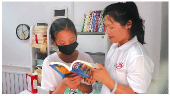 6月24日,志愿者与济南章丘区“希望小屋”受助孩子同读一本书。