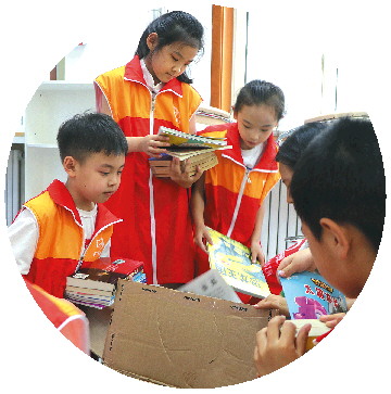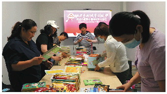 齐鲁志愿者为“希望小屋”受助孩子挑选书籍。