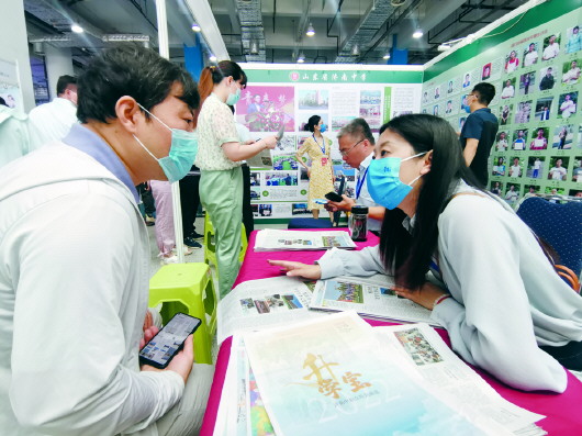 在历城职专展位,两个学生一个拿着玉米,一个拿着西红柿正在现场展示直播营销。“学生们展示的是我们学校电子商务专业的一门课程,我们平时在学校有自己的直播软件,此外还会教学生直播技巧、直播话术、文案脚本写作等内容,目前毕业的学生中也有很多从事电商行业的,这门课的开设是我们学校结合当下发展做出的一个新尝试,为学生就业提供更多出路。”学校工作人员介绍。