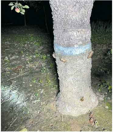 晚八点左右,天渐渐黑了,游客和农户拿着手电筒照亮树根处,看到棕色的知了猴一只又一只从土里冒出来,缓缓爬上树干。有的树干上同时聚集着数十只知了猴。“树上都缠了透明的塑料薄膜,这些知了猴只能在树根处徘徊,爬得最高不过离地二三十厘米。”
