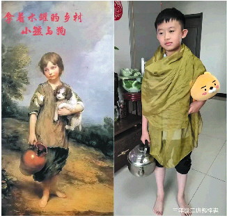 在模仿的过程中,学生们尝试用心灵感受和发现美,用自己的方式大胆表现和创造美。他们寻找挑选家中的毛巾、勺子、果盘、妈妈的小饰品等,将其作为模仿秀的材料利用,再配上惟妙惟肖的表情和动作,把自己扮成经典绘画作品的画中人。