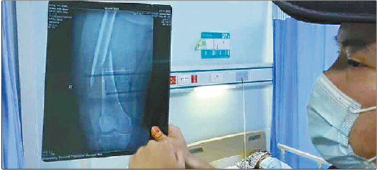 “右腿股骨干断成两截了,靠近膝盖的骨头也裂了一条缝。”来到医院一检查,郭先生吓了一跳,“住院当天,我妈就做了手术。”郭先生母亲右腿X光片显示:老人右腿股骨中间段有一道明显的裂缝,整条股骨断成两截;靠近膝盖处的骨头处也有一道明显的裂痕。