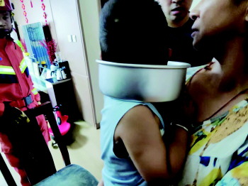 7月20日16时35分,即墨区消防救援大队接到报警称,位于即墨区潮海街道万科朗润园小区一名小孩在家中头被卡住,急需救助。接到报警后,大队119指挥中心立即调派城北三路消防救援站出动力量赶赴现场。经询问得知,一名2岁的男童由于贪玩,将铝制蛋糕模具套到脖子上无法取下。,消防救援人员让家长抱紧孩子,固定住其头部,在做好安全保护措施的前提下,使用剪断钳对模具的一侧进行剪切,扩大救援空间,3分钟后模具被成功取下。由于救援及时,孩子并无大碍。