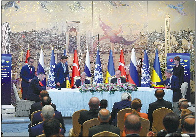 ◥22日,土耳其国防部长阿卡尔(右)、联合国秘书长古特雷斯(中左)与乌克兰基础设施部部长库布拉科夫(左)签署协议。 新华社发