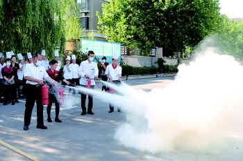 在应急演练环节,假设单位发生火灾,立即启动灭火救援应急预案,组织员工疏散逃生,并拨打119报警电话。微型消防站队员和消防指战员先后到达现场,迅速将“火灾”扑灭。演练结束后,消防指战员现场演示了灭火器、消防水带的使用方法,并组织员工进行了实际操作,加强学习效果。