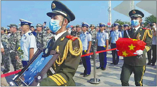 李林雨烈士的遗像与骨灰盒在礼兵的护卫下抵达滨湖广场的悼念台。 记者 王坤 摄