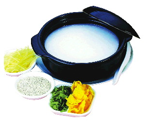这种粥虽叫“白粥”,但火候到家的粥并不是纯白色的,而是带有一点淡淡的黄色,那色泽看着就诱人。还没出锅,锅里的粥早就醇香扑鼻了。熬好的粥一定要用特制的大粥缸来盛,这种“缸”是用陶土做成的特大型陶罐,口和底都很小,肚子却极大,一缸能装一二百碗粥。盛粥的大缸通常是用麦秸包裹,然后在外面套上白色的布套,布套上往往用隶书写一个大大的“粥”字。这种装备既美观又能保温,即便是寒冬下雪的天气,缸里的粥放上五六个小时依然会是滚烫的。舀粥的勺子也是特制的,传统上是用较粗的竹竿截去一头,留个节做底,在侧面绑上一个瓢,大小以一瓢一大碗为准。