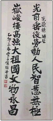 先说郭老题写的“光岳楼”匾(图二)。说此匾额,就不能不提李士钊先生。李先生是聊城城里人,上世纪三十年代考入上海音乐专科学校。抗战后参与《抗战日报》创办工作。1945年为中国赴纽约参加联合国成立大会代表团翻译《联合国歌》。抗战胜利后,在上海担任陶行知先生创办的上海武训学校校长,他曾邀请郭老为该校教授。上世纪五十年代初期,因批判其参与编写的《武训传》而受到冲击。1957年因受到大批判离开文化部,回到山东任山东地方志办公室主任。1967年被“遣返”老家聊城,后在地方印刷厂做校字员。1974年是光岳楼建成600周年,李先生萌生请郭沫若先生为光岳楼题匾额的想法。囿于当时特殊环境,他无法进京,就写信给茅盾先生代为转达。郭老知晓后,很快写好并寄到聊城。同样的内容郭老写了两幅,一为繁体字,一为简体字,后选取繁体字幅放大刻制了匾额,悬于光岳楼上至今。郭老题字原件现珍藏于聊城市东昌府区档案馆。我还见过一张照片,是郭老题写的墨宝刻成匾额后,李先生与匾额的一张合影。李先生头戴“火车头”帽子,穿着宽松的棉衣棉裤,昂首挺胸站在高及肩膀的匾额前,嘴角微翘,双手攥拳,那种神态,在逆境中的乐观神态让人难忘。