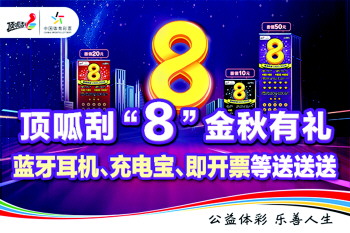2022年9月2日9:00至9月29日24:00,购彩者购买任意面值“8”主题系列即开票,在完成奖金兑付后(如中奖),通过“中国体育彩票”APP或微信小程序扫描票面保安区二维码,登录活动页面即有机会获得运动蓝牙耳机、无线充电宝、筋膜枪等精美奖品,奖品全国共计22988个,领完即止。