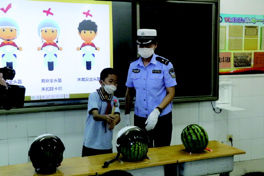 本报讯(记者 王震 通讯员 刘顺) 为进一步加强校园交通安全管理工作,提高学生交通安全教育工作水平,9月1日,威海市公安局交警支队一大队民警走进威海市北竹岛小学,为同学们带去一堂生动的交通安全体验课。课堂上,借助西瓜、头盔、锤子等工具,模拟在交通事故发生时,不佩戴安全头盔、不规范佩戴安全头盔和规范佩戴安全头盔三种情况下头部受到的伤害情况。演示中,不戴头盔的西瓜在一次敲击过后,锤子深深的砸进西瓜内部,造成了巨大的伤害;没有系牢卡扣的头盔经过一次敲击后头盔脱落,西瓜在面对二次敲击时已丧失保护能力;规范佩戴头盔的西瓜在经历过两次大力敲击后纹丝不动,西瓜完好无损,生动的演示效果带给同学们直观真实的感受,也在同学们心中种下了安全的种子。随后民警通过卡片展示,带领同学们共同认知了基本的交通安全标志,丰富了交通安全知识。